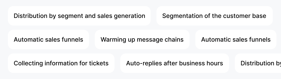 has everything you need to work with VK, Telegram, Viber, WhatsApp, and email bots and solve different problems